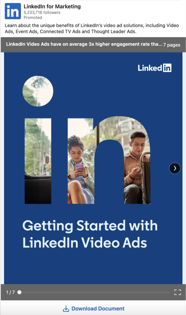 Every document needs a very clear title because your viewers need to know what exactly they see. An important note here is that the document can be downloaded and if you have added links into the document, they can now be clicked. Keep in mind that the document has a line at the bottom and the top of the design, so no text should be present there. These posts have very high performance as the platform counts every click on the arrows to move to the next slide as a click on your post.
