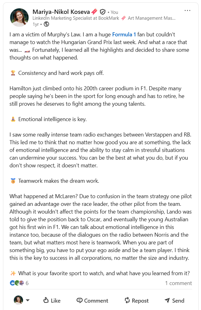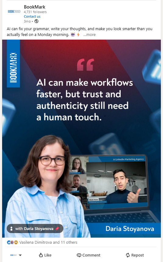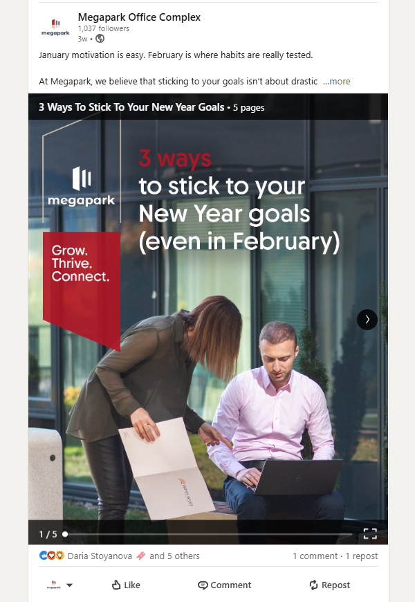 In text-only posts, you can add only text and of course – emojis and hashtags which will help you grab the audience’s attention and boost your post’s reach. The characters should be up to 1300. Using emoticons is not a bad idea because they can direct the reader to important points of your text. For example, you can put them at the beginning of a new paragraph, instead of bullet points to make your posts more visually appealing. The tactics we use when adding hashtags – two common hashtags that you know many people follow, two corporate and the last one or two to be specifically related to the topic.