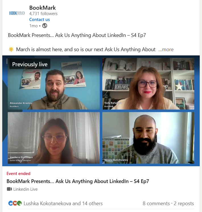 These are the native videos uploaded directly on the platform. They can autoplay in the feed and have greater reach, in comparison to posts of videos from external services, such as YouTube. What you should do is to add subtitles to each video because 79% of the viewers on LinkedIn watch with the sound off. In this way, they can understand the content and watch it even without audio on. The length can’t be more than 10 minutes, and we suggest you keep them from 30 seconds to 90 seconds max. If you wonder how to incorporate the video format in your content calendar, you can start with short video series with relevant content, interviews, tutorials, industry insights videos, etc.